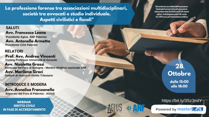 EVENTI 2022 EVENTI 2022 La Professione Forensetra associazioni multidisciplinari,società tra avvocati e studio individuale. Aspetti civilistici e fiscali” 28 Ottobre 2022 Ore 15:00 5 3 crediti formativi Diritto Civile Iscriviti all’evento NON sei socio agius? […]